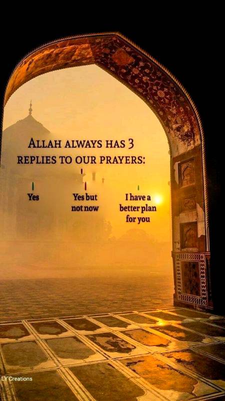 Mishaal.khan786 : ....Allah always has 3 replies to our prayers... - 5 years, 8 months ago LINK 15REPLIES More images by Mishaal.khan786: