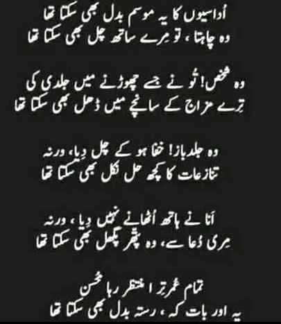 کچھ عمر کی پہلی منزل تھی🌹 کچھ رشتے تھے انجان بہت 🌹کچھ ہم بھی پاگل تھے لیکن 😊کچھ وہ بھی تھے نادان بہت ❤کچھ اس نے بھی نہ سمجھا یا ❤یہ پیار نہیں آسان بہت😔جب بچھڑ گئے تو یہ جانا🌹یہاں آتے ہیں طوفان بہت 🌹اب کوئی نہیں جو اپنا ہو😔ملنے کو تو ہیں انسان بہت اے کاش وہ واپس آجائے 😘یہ دل ہے اب سنسان بہت ❤❤❤🌹🌹🌹😘😘