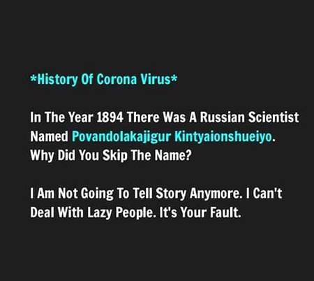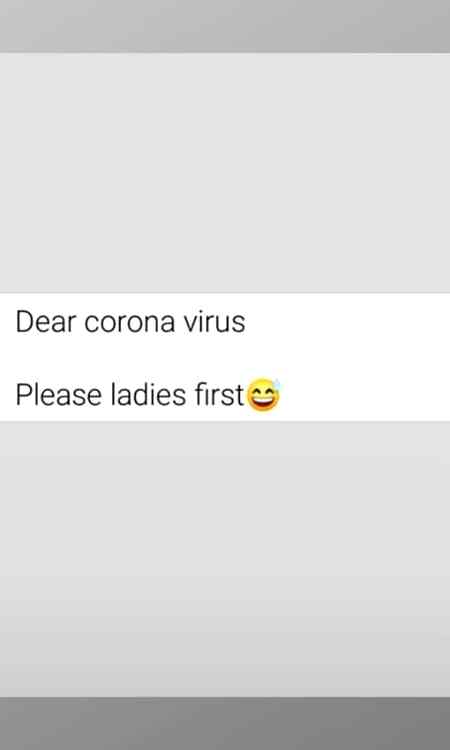 Abbaxii : Dear corona virus please ladies first....hahaha....just fun...😂 - 76 months ago FOLLOW 6REPLIES SHARE LINK REPORT