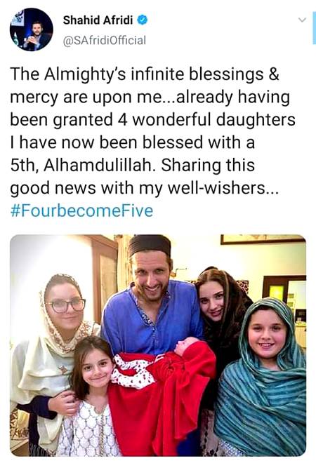 Abbaxii : Shahid khan afridi blessed with another daughterโค - 77 months ago FOLLOW 0REPLIES SHARE LINK REPORT