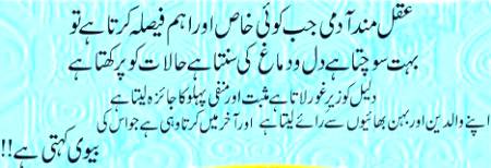 میرے محلے میں ماسٹر عتیق صاحب رہتے ہیں، 44 سال کی عمر میں اُن کی شادی ہوئی ایک دن فرماتے ہیں کہ جب میں 23 سال کا تھا تو ڈائری میں 21 ایسی خوبیاں نوٹ کی جو میری مُتوقع بیوی میں ہونی چاہیے وقت گزرتا گیا لیکن ایسی بیوی نہ مِل سکی جس میں 21 خوبیاں ہوں، اور ماسٹر عتیق ہر سال ایک دو خوبیاں کاٹتے رہے کہ چلو یہ خوبیاں نہ بھی ہوں تو لڑکی قبول ہے بالاآخر 40 سال کے ہوگئے اور ڈائری میں صرف ایک خوبی لکھی رہ گئی "عورت ہو"