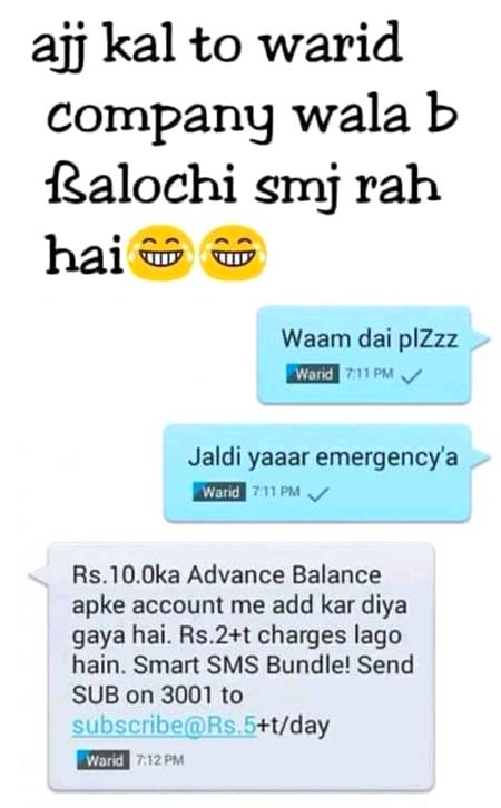 Baloch_Cute : Aj Kal to warid company wala bh balochi samjh rha hy - 74 months ago FOLLOW 0REPLIES SHARE LINK REPORT
