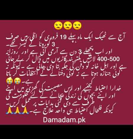السلام علیکم ورحمتہ اللّٰہ وبرکتہ یا اللہ انسانیت پر رحم فرما 😓😓 ہم تیرے گناہ گار بندے تیری بارگاہ میں دست دعا ہیں اے اللہ تو ستر ماؤں سے زیادہ محبت کرنے والا ہے. اپنے پیارے حبیب پاک صل اللہ علیہ والہ وسلم کے صدقے دنیا کو اس موذی مرض سے نجات عطا فرما. آمین یا رب العالمین 🤲🤲