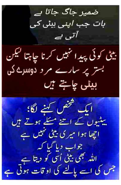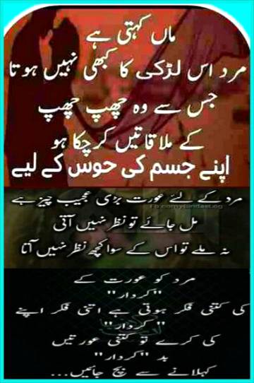 Mukhlis mard kisi larki ki izzat abrooh ruswah nahi kiya krty.. Larki k Jisam sy khelny ko piyar nahi kaha krty... Jo hoty hain neik maa baap ki tarbiyat ka natijah.. Wo kabhi kisi ki beti bhen ko ghar sy bhagaya nahi krty.. Jo rakhty hain izzat chadar main dhanp k apni maa bhen beti ki... Wo kisi ki beti bhen k jisam sy kapry utarwaya nahi krty