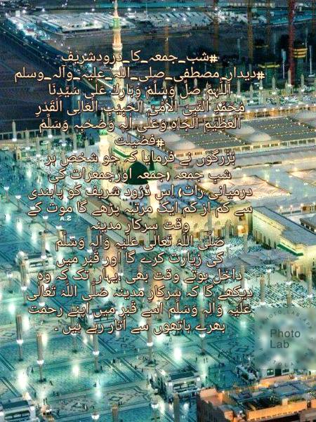 🌹#شب_جمعہ_کا_درودشریف🌹🌹 #دیدار_مصطفی_صلی_اللہ_علیہ_وآلہ_وسلم🌹🌹اَللّٰہُمَّ صَلِّ وَسَلِّمْ وَبَارِكْ عَلٰی سَیِّدِنَا مُحَمَّدِ النَّبِیِّ الْاُمِّیِّ الْحَبِیْبِ الْعَالِی الْقَدْرِ الْعَظِیْمِ الْجَاہِ وَعَلٰۤی اٰلِہٖ وَصَحْبِہٖ وَسَلِّمْ🌹🌹#فضیلت🌹🌹بُزُرگوں نے فرمایا کہ جو شخص ہر شبِ جمعہ (جمعہ اورجمعرات کی درمیانی رات) اِس دُرُود شریف کو پابندی سے کم از کم ایک مرتبہ پڑھے گا موت کے وقت سرکارِ مدینہ صَلَّی اللّٰہُ تَعَالٰی عَلَیْہِ وَاٰلِہٖ وَسَلَّم کی زِیارت کرے گا اور قَبْر میں داخل ہوتے وقت بھی ،یہاں تک کہ وہ دیکھے گا کہ سرکارِ مدینہ صَلَّی اللّٰہُ تَعَالٰی عَلَیْہِ وَاٰلِہٖ وَسَلَّم اسے قَبْر میں اپنے رحمت بھرے ہاتھوں سے اُتار رہے ہیں ۔