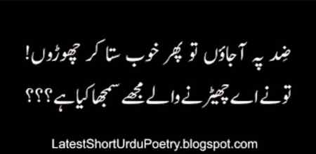 Urdu Poetry Shada_99 - 80 months ago : سیاہ رات کے دامن میں چھپ کے روتے ہیں. بہت سے خواب جنہیں روشنی نہیں ملتی. FOLLOW 0REPLIES REPORT Sad Poetry Shada_99 - 80 months ago آپ کے دل میں قید ہیں سانسیں ہماری ❤ دھڑکتے رہا کرو ورنہ مر جائیں گے ہم😘 FOLLOW 0REPLIES REPORT Urdu Poetry Shada_99 - 80 months ago کون دیکھتا ہے اب کسی کو سیرت ِ اخلاق کی نظر سے💕 صرف خوب صورتی کو پوجتے ہیں نئے زمانے کے لوگ💕I Think That's right In current Time FOLLOW 0REPLIES REPORT Urdu Poetry Shada_99 - 80 months ago سجنے سنورنے کی تمہیں کیا ضرورت ہے.....! تم تو سادگی میں بھی قتل عام کرتی ہو......!! FOLLOW 2REPLIES REPORT Sad Poetry Shada_99 - 80 months ago اندر کوئی جهانکے تو ٹکڑوں میں ملوں گا ہنستا هوا چہرا تو زمانے کے لئے هے,,,,!! FOLLOW 0REPLIES REPORT submitted by uploaded by profile: Sorry! Ap apne item ya profile ko report nahi kar saktey, na hi apne ap ko block kar saktey hain PREV NEXT ABOUT PRIVACY POLICY SIGN UP LOGIN IMAGES