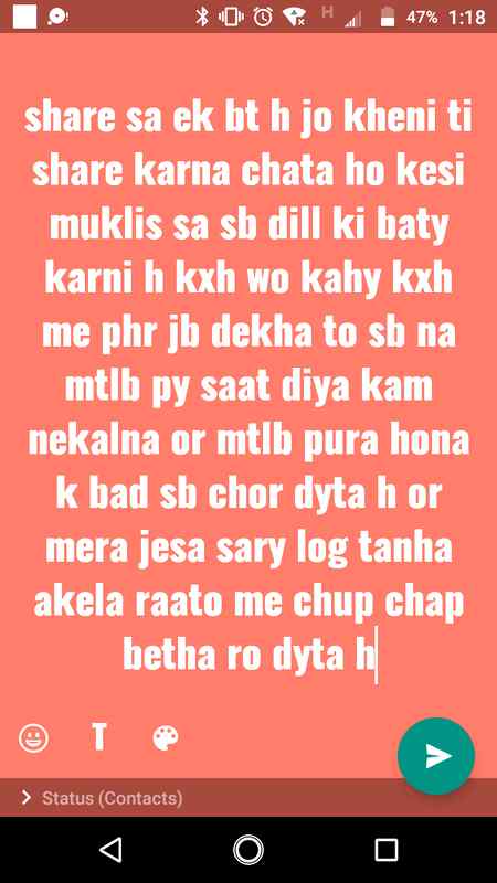 share sa ek bt h jo kheni ti share karna chata ho kesi muklis sa sb dill ki baty karni h kxh wo kahy kxh me phr jb dekha to sb na mtlb py saat diya kam nekalna or mtlb pura hona k bad sb vhor dyta h or mera jesa sary log tanha akela raato me chup chap betha ro dyta h