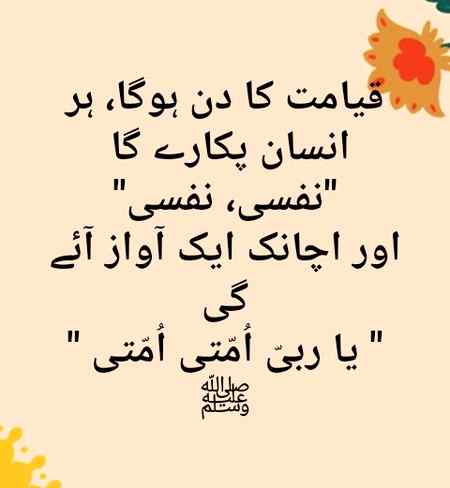 fatiman : -"قیامت کا دن ھوگا-" -"ھر انسان پُکارے گا-" -"نفسی نفسی-" -"اور اچانک ایک... MORE▼آواز آئے گی یا ربی اُمّتی اُمّتی ﷺ ❤ - 75 months ago FOLLOW 40REPLIES SHARE LINK REPORT