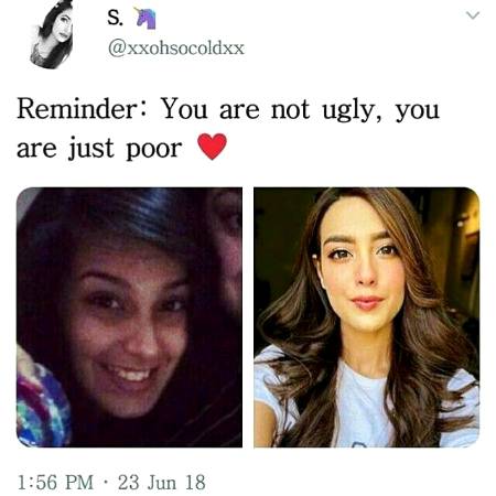 izzah786 : iqra aziz... u aren't ugly you are just poor... true - 77 months ago FOLLOW 8REPLIES SHARE LINK REPORT